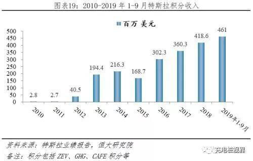 據(jù)特斯拉披露,2010-2019Q3特斯拉累計(jì)積分銷售收入21.68億美元,其中2016、2017、2018年,ZEV和非ZEV積分收入分別為2.15、0.87,2.80、0.81,1.03、3.15億美元。