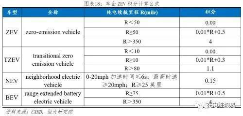 (2)ZEV積分公式:CARB根據(jù)下表所示積分公式計(jì)算各企業(yè)ZEV積分,并進(jìn)行年度公示。根據(jù)《Health and Safety Codesection 43211 civil penalty》條例,對(duì)于不滿足ZEV積分要求的公司,每個(gè)ZEV積分罰款5000美元。