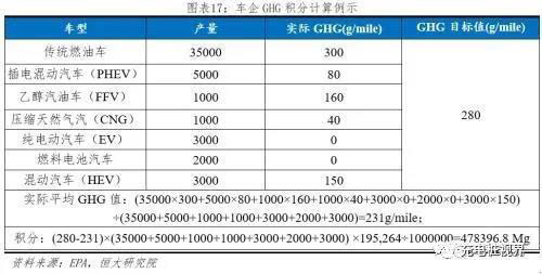 GHG標(biāo)準(zhǔn)采用積分制管理。EPA每年發(fā)布年度各車企GHG報(bào)告,對(duì)各車企積分進(jìn)行公示,產(chǎn)生負(fù)積分的企業(yè)需要購買GHG正積分進(jìn)行沖抵。GHG積分=(GHG目標(biāo)值-GHG實(shí)際值)×產(chǎn)量×全生命周期里程÷1000000。其中全生命周期里程:乘用車為195264英里;積分單位:Mg(megagrams兆克)。假設(shè):車企A年產(chǎn)50000輛乘用車,各車型產(chǎn)量分布如下,則計(jì)算可得該年實(shí)際積分為:478396.8Mg。