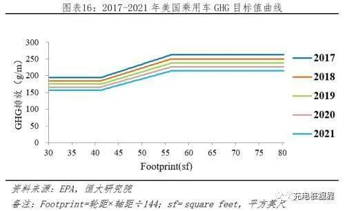 1)CAFE和GHG標(biāo)準(zhǔn):2010年5月,奧巴馬要求美國環(huán)保署(EPA)和美國公路安全管理局(NHTSA)根據(jù)《Clean Air Act》和《Energy Independence and Security Act of 2007》推行國家級(jí)2017-2025年輕型車項(xiàng)目,以提升CAFE和降低GHG排放。其中,EPA負(fù)責(zé)制定2017-2025年GHG標(biāo)準(zhǔn),NHTSA負(fù)責(zé)制定2017-2025年CAFE標(biāo)準(zhǔn)。GHG政策第一階段“2017-2021”標(biāo)準(zhǔn)已頒布,第二階段“2022-2025”標(biāo)準(zhǔn),因2018年4月2號(hào),特朗普政府指責(zé)過于嚴(yán)苛,影響就業(yè),需重新修改,新版本暫未公布。CAFE政策第一階段“2017-2021”標(biāo)準(zhǔn)已頒布,第二階段“2022-2025”標(biāo)準(zhǔn)中期評(píng)估中,暫未公布。CAFE與GHG相似處頗多:1)皆采用積分制,GHG排放低于目標(biāo)值可獲得正積分,反之負(fù)積分;2)其標(biāo)準(zhǔn)值皆是分車型、參考汽車占地面積“Footprint”為參考。以GHG標(biāo)準(zhǔn)為例,其2017-2021年乘用車目標(biāo)值曲線如下,對(duì)于不滿足GHG標(biāo)準(zhǔn)的車企,根據(jù)《Clean Air Act》第205條款,最高可單車罰款37500美元。
