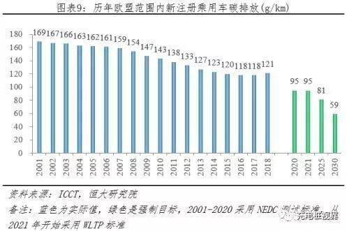 1)目標(biāo)值降幅大:2021年開始采用新測(cè)試標(biāo)準(zhǔn)WLTP,乘用車排放不得高于95g/km,2025年、2030年分別在2021年基礎(chǔ)上減少15%、37.5%。據(jù)國際清潔交通委員會(huì)(ICCT)披露,歐盟乘用車企實(shí)際碳排放從2001年169g/km下降到2018年121g/km,年均降幅僅1.9%。
