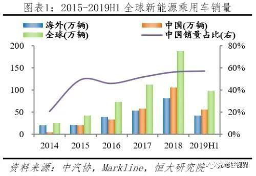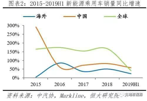 2019上半年中國新能源乘用車市場(chǎng)份額過半,增速遠(yuǎn)超海外。據(jù)中汽協(xié)統(tǒng)計(jì),2019H1國內(nèi)新能源乘用車(EV+PHEV)銷售56.29萬輛,同比增長57.75%。據(jù)Markline統(tǒng)計(jì),2019H1海外新能源乘用車銷售42.13萬輛,同比增長24.50%。2019H1全球新能源乘用車合計(jì)銷售98.42萬輛,中國占比57.19%,超過一半,增速較國外高33.25個(gè)百分點(diǎn)。