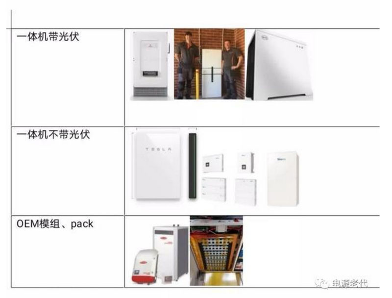 再來看產(chǎn)品路線。具體來說大致有四種:分體機(jī),一體機(jī)帶光伏,一體機(jī)不帶光伏,OEM提供模組或pack。市場(chǎng)上代表性的產(chǎn)品舉例如下: