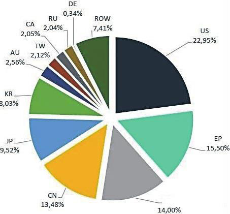 各企業(yè)在美國(guó)、韓國(guó)、世界知識(shí)產(chǎn)權(quán)組織、中國(guó)、歐洲、日本申請(qǐng)的5G專利族比例如圖2所示。