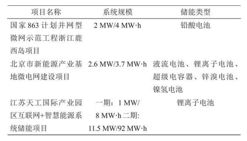另外由于大工業(yè)用電的峰谷電價差相對于普通工商業(yè)峰谷電價差小,因此可通過峰谷套利與降低需量電費相加的模式進行盈利分析。為進一步縮小成本提高收益,實現(xiàn)電池的充分利用,選用梯次電池代替新電池的儲能應(yīng)用模式逐漸推廣開來。2019年8月6日在深圳市比克工業(yè)園區(qū)投運的2.15 MW/7.27 MW·h梯次電池儲能項目,采用三元及磷酸鐵鋰電池、兩充兩放的技術(shù)方案,實現(xiàn)削峰填谷、重要負荷應(yīng)急保障供電等功能。表6列舉了國內(nèi)目前已建成的部分儲能微電網(wǎng)項目。