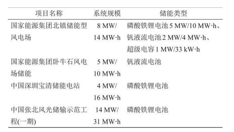 相比于其他領(lǐng)域,儲能在新能源并網(wǎng)應(yīng)用中需要滿足一些特殊要求:由于新能源電站所處地理位置較為偏遠,儲能系統(tǒng)需滿足配置靈活、安裝方便、使用壽命長等特點,以減少建設(shè)周期,并盡可能做到減少維護或免維護;另外新能源電站環(huán)保要求較高,儲能電池、裝置在選擇時應(yīng)盡量具備綠色無污染等特點。儲能系統(tǒng)的放電以低倍率0.5 C、1 C為主,PCS接入方式以百千瓦級多機并聯(lián)經(jīng)過升壓接入6 kV或10 kV母線為主。目前,鋰離子電池或釩液流電池被公認為該應(yīng)用領(lǐng)域的主要技術(shù)手段[17],其中磷酸鐵鋰電池市場占較高,而隨著三元鋰電池在電化學(xué)儲能項目中暴露出來與日增加的安全問題,越來越多的集成商逐漸避免采用三元鋰系電池。另外,超級電容在功率波動平抑,鉛碳電池在棄風(fēng)、棄光回收等應(yīng)用場合也有應(yīng)用案例。表4中列舉了國內(nèi)具有代表性的大規(guī)模新能源并網(wǎng)項目。