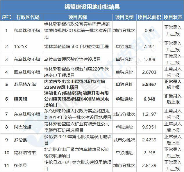 分別為:內(nèi)蒙古華電金山錫盟蘇尼特左旗225MW風電項目、深能北方(錫林郭勒)能源開發(fā)有限公司鑲黃旗德斯格圖400MW風電場項目、斯能阿巴嘎旗3號風電場一期150MW風電項目、華潤電力新能源投資有限公司太仆寺旗300MW風電項目、內(nèi)蒙古華電蘇尼特左旗滿都拉圖一期100MW風電項目、內(nèi)蒙古京能蘇尼特風力發(fā)電有限公司30萬千瓦風電項目;