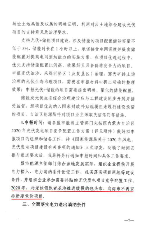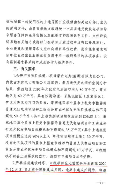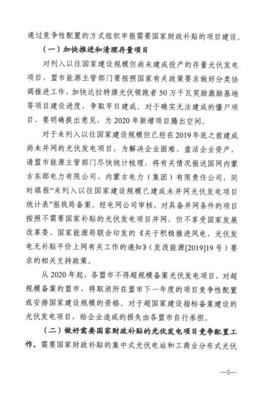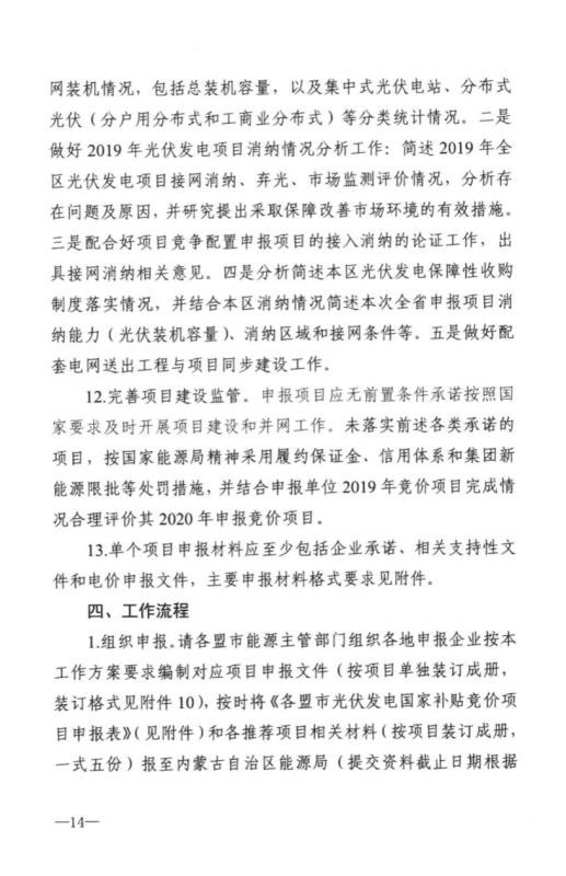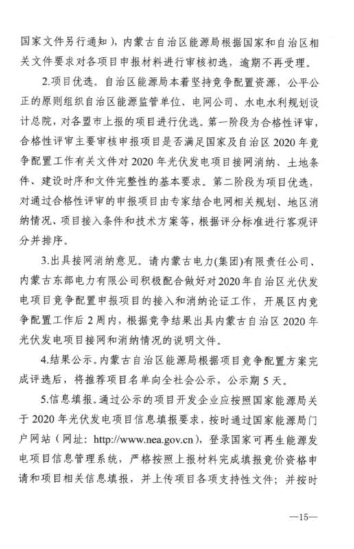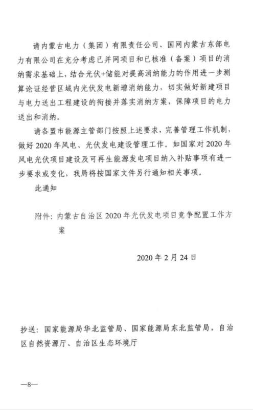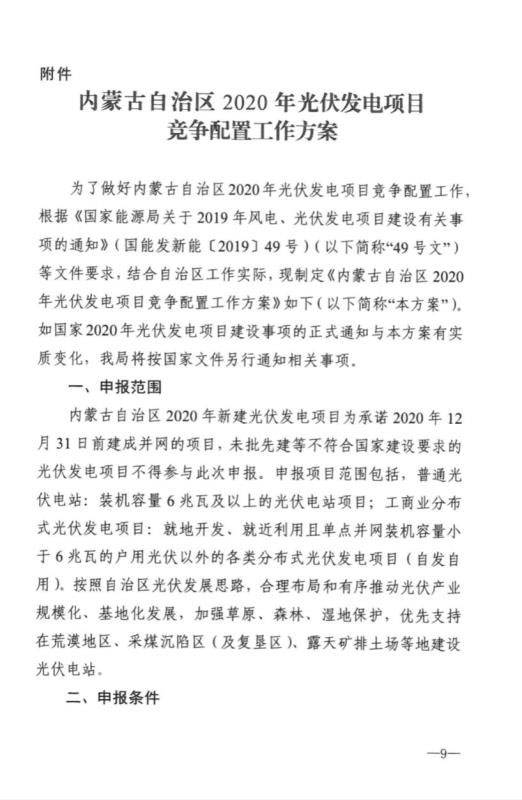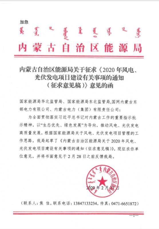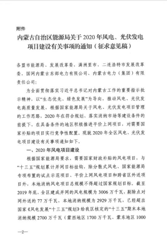 近日,內(nèi)蒙古自治區(qū)能源區(qū)印發(fā)關(guān)于征求《2020年風(fēng)電、光伏發(fā)電項(xiàng)目建設(shè)有關(guān)事項(xiàng)的通知(征求意見稿)》意見的函。2020年內(nèi)蒙古自治區(qū)新增的光伏發(fā)電消納空間全部通過競爭性配置的方式組織申報需要國家財政補(bǔ)貼的項(xiàng)目建設(shè)。