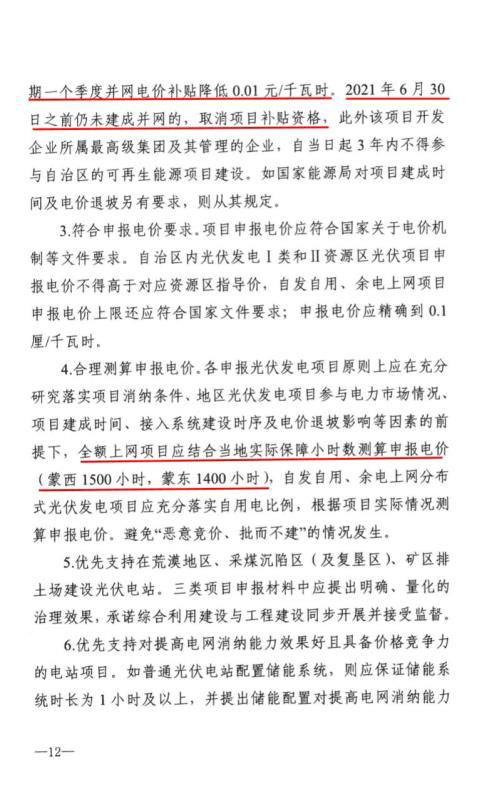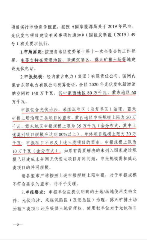 根據(jù)文件,2020年新增光伏發(fā)電消納空間全部通過競爭性配置組織申報,主要支持荒漠、采煤沉陷區(qū)(復(fù)墾區(qū))、露天礦排土場。2020年光伏新增消納空間共1.4GW,其中蒙西800MW、蒙東600MW。