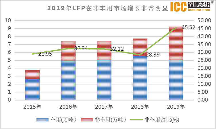 根據(jù)鑫欏資訊統(tǒng)計,2019年磷酸鐵鋰材料產(chǎn)量9.27萬噸,其中車用市場消耗僅5萬噸,同比少消耗0.5萬噸,而非車用市場用量則達到4.27萬噸,份額大幅提升至45.52%,變化明顯。