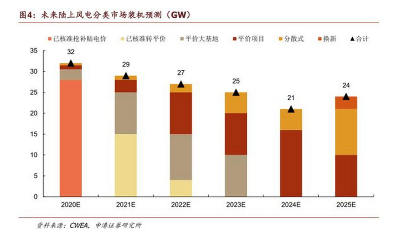 風(fēng)電行業(yè)在2020年將進(jìn)入搶裝高峰期,由于此次搶裝是帶補(bǔ)貼項(xiàng)目和平價大基地項(xiàng)目共同推進(jìn),并且政策鼓勵已核準(zhǔn)項(xiàng)目后續(xù)轉(zhuǎn)為平價項(xiàng)目,無論從政策制定端還是市場端,均有意將這次搶裝周期平滑,避免2021年后出現(xiàn)的大滑坡。我們認(rèn)為在平價大基地項(xiàng)目、轉(zhuǎn)平價項(xiàng)目的支撐下,未來五年風(fēng)電年新增裝機(jī)量將會維持在20~30GW之間,2025年累計裝機(jī)容量將接近400GW。平價項(xiàng)目成為主流的同時,分散式項(xiàng)目也即將迎來長足的發(fā)展。2025年后將陸續(xù)迎來機(jī)組換新,將會帶來新一輪增量。