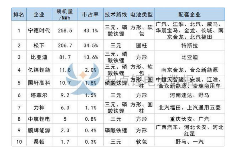今年2月份,共有25家動(dòng)力電池企業(yè)實(shí)現(xiàn)裝機(jī),環(huán)比減少42%,排名前十的企業(yè)分別是寧德時(shí)代、松下、比亞迪、億緯鋰能、國(guó)軒高科、塔菲爾、力神、中航鋰電、鵬輝能源和桑頓,10家企業(yè)合計(jì)市場(chǎng)份額超過(guò)99%,僅寧德時(shí)代一家占比超四成,松下占比超3成。