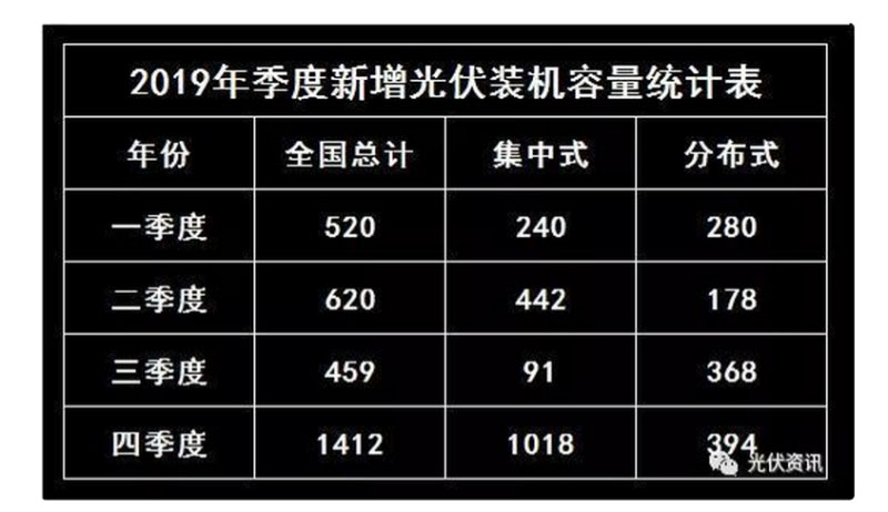 2019年前三季度,光伏新增容量僅有約16GW,第四季度新增14GW,其中集中式新增10GW,分布式新增4GW;根據(jù)【光伏資訊】的了解,大部分的地面光伏電站并非全容量并網(wǎng),由此造成四季度的裝機(jī)量激增。Mr.Yang個(gè)人估計(jì)2019年全年光伏實(shí)際新增裝機(jī)容量在25GW左右。