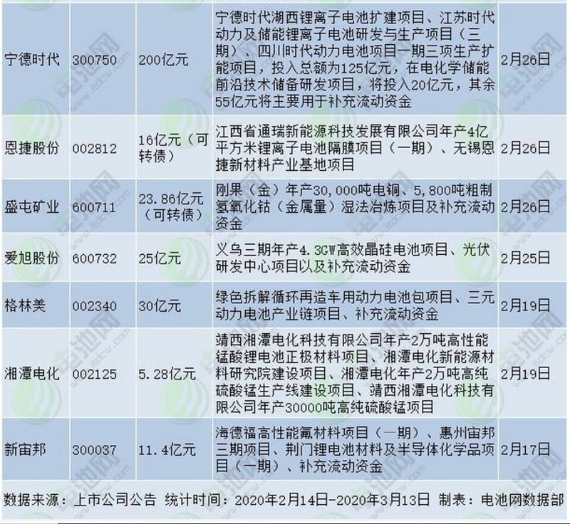據(jù)電池網(wǎng)不完全統(tǒng)計,自2月14日再融資新政發(fā)布以來,在短短一個月的時間里,滬深兩市已有京泉華、鴻達興業(yè)、中利集團、億緯鋰能、易事特、長盈精密、豐元股份、道氏技術、寧德時代、恩捷股份、盛屯礦業(yè)、愛旭股份、格林美、湘潭電化、新宙邦等15家新能源電池產(chǎn)業(yè)鏈企業(yè)宣布定增融資或發(fā)行可轉(zhuǎn)債融資方案,擬融資金額總計471億元,平均每家融資31.4億元。