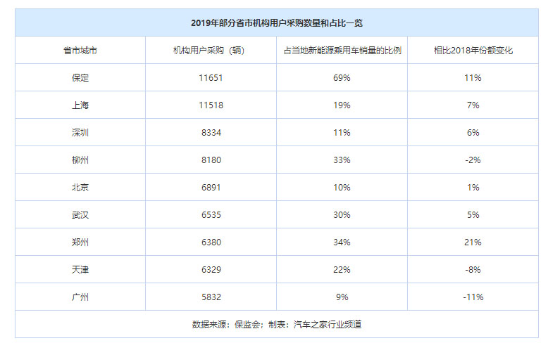 新能源乘用車的大買主除出租租賃平臺之外,還有自用非運(yùn)營的單位用戶為其銷量增長做貢獻(xiàn)。機(jī)動車交強(qiáng)險(xiǎn)數(shù)據(jù)顯示,2019年,機(jī)構(gòu)用戶采購新能源乘用車共計(jì)15.87萬輛,占比18%,相比2018年提升了2個百分點(diǎn)。分區(qū)域看,部分城市如河北保定的機(jī)構(gòu)用戶是拉動當(dāng)?shù)匦履茉闯擞密囦N量的主力。