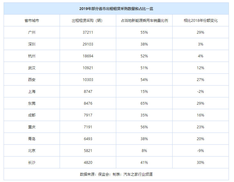從上表可看出,多個省市的出租租賃平臺為當(dāng)?shù)匦履茉闯擞密嚨匿N量做出了較大貢獻(xiàn),且貢獻(xiàn)力度仍有加大趨勢。據(jù)業(yè)內(nèi)人士介紹,出租平臺主要指當(dāng)?shù)氐某鲎廛嚬?,但不同城市的出租車運(yùn)營主體不同,如深圳以整車企業(yè)為主導(dǎo),比亞迪在當(dāng)?shù)嘏c深圳巴士集團(tuán)合資成立了鵬程電動出租車運(yùn)營公司;北京是由平谷、密云等各區(qū)縣政府主導(dǎo),與電力公司、本地整車廠共建各自的出租車運(yùn)營公司運(yùn)營。