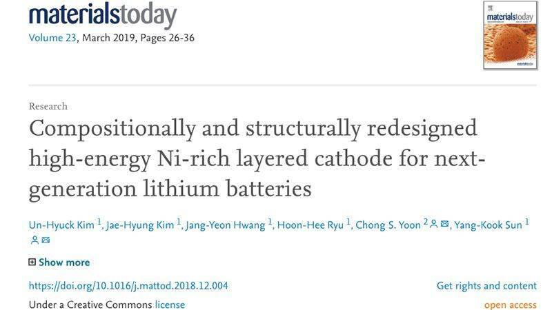 Un-Hyuck Kim團(tuán)隊在2019年3月發(fā)布于Materialstoday的論文《成分與結(jié)構(gòu)重新設(shè)計的高能富鎳正極,用于下一代鋰電池》。