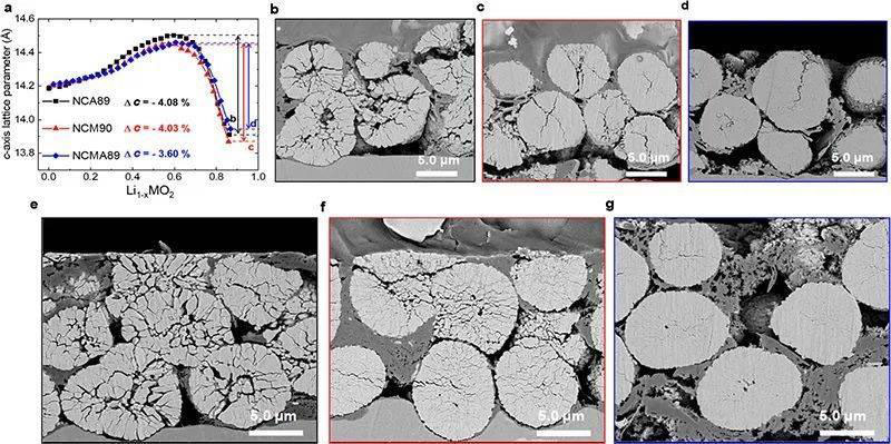 上文描述中已經(jīng)提到,NCMA89電極較難出現(xiàn)H2-H3的不可逆相變,其具備較強(qiáng)的機(jī)械穩(wěn)定性。Un-Hyuck Kim團(tuán)隊的實驗也證明了這一點,在多次充放電循環(huán)后,NCMA89電池正極材料的微裂紋明顯少于NCM90與NCA89電池。