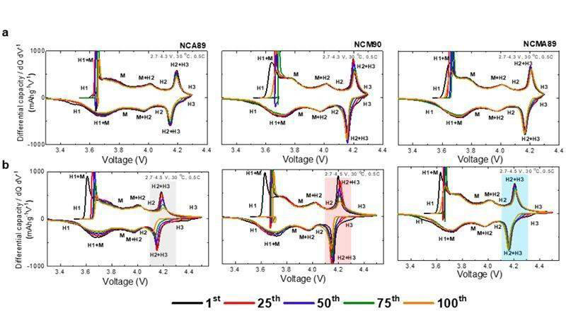 通過對NCMA89、NCA89、NCM90三類電池進(jìn)行100次的充放電循環(huán)測試,Un-Hyuck Kim團(tuán)隊發(fā)現(xiàn),只有NCMA89的H2-H3不可逆相變的電壓幾乎維持在了初始的狀態(tài),而NCM90與NCA89電池的H2-H3不可逆相變的電壓均出現(xiàn)了不同程度的下滑,氧化還原峰下降。