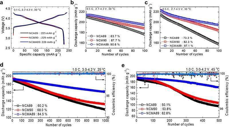 其中,鎳含量90%的NCM90電池?fù)碛?29mAh/g的初始放電容量,鎳含量89%的NCA89與NCMA89則分別擁有225mAh/g與228mAh/g的初始放電容量。