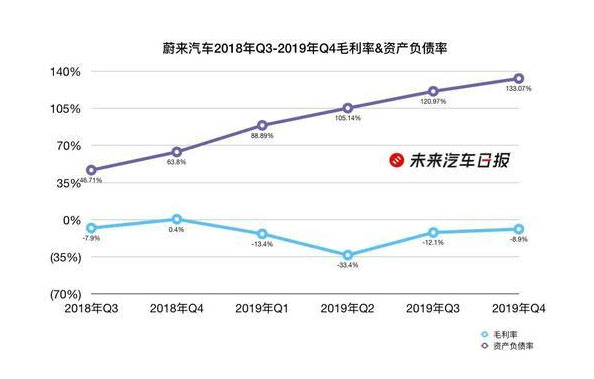 蔚來汽車2018年Q3-2019年Q4毛利率&資產(chǎn)負債率,制圖:未來汽車日報