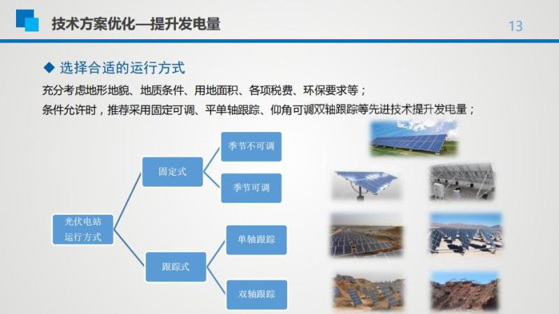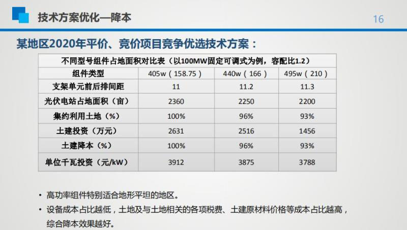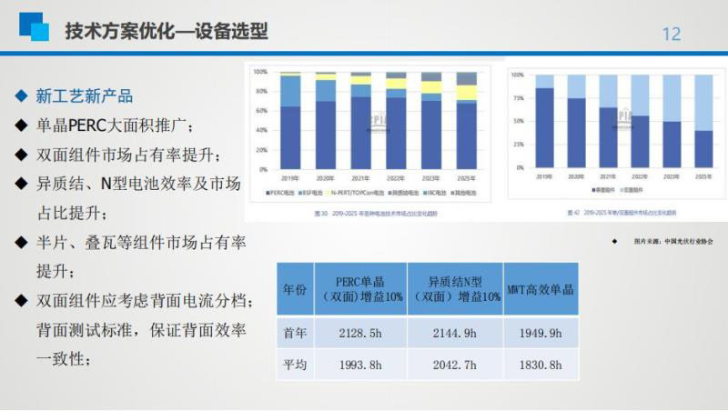 實際轉(zhuǎn)換效率才是真正提升發(fā)電量的指標(biāo),因此在先進技術(shù)選型上應(yīng)更多關(guān)注實際轉(zhuǎn)換效率。據(jù)惠星介紹,在降低度電成本方面,高功率組件特別適合地形平坦的地區(qū)。設(shè)備成本占比越低,土地及土地相關(guān)各項稅費,土建原材料價格、鋼材、水泥等成本占比越高,高功率組件的綜合降本效果越好。此外,在選擇支架合適的運行方式時,應(yīng)充分考慮項的目地形地貌、地質(zhì)條件、用地面積能否有效率用、各項稅費占比、環(huán)保要求是否嚴(yán)苛等。條件允許時,推薦采用固定可調(diào)、平單軸跟蹤、仰角可調(diào)雙軸跟蹤等先進技術(shù)提升發(fā)電量。