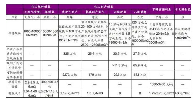 (1)從出廠成本來(lái)看,焦?fàn)t氣、氯堿、丙烷脫氫制丙烯和乙烷裂解制烯烴副產(chǎn)的粗氫氣可以經(jīng)過(guò)脫硫、變壓吸附和深冷分離等精制工序后作為燃料電池車(chē)用氫源,成本遠(yuǎn)低于化工燃料制氫、甲醇重整制氫和水電解制氫等路線。