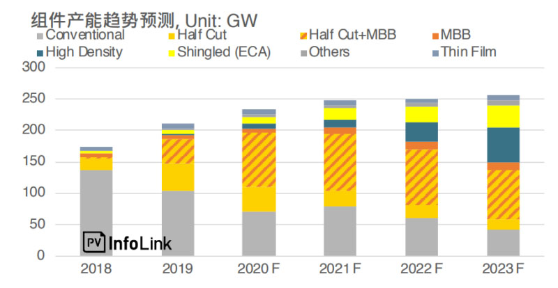 根據(jù)PVInfoLink數(shù)據(jù),盡管從2019年開始,組件技術(shù)便開始以半片+多主柵為標配進行技改或者擴產(chǎn),截止2019年底,半片+多主柵的產(chǎn)能達到約38GW,但實際產(chǎn)量到2020年2季度才開始逐漸升溫,2020年1季度半片+多主柵的產(chǎn)能僅有500-700MW/月。