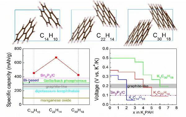 苯乙烯材料(上)在嵌入鉀時(shí)的理論比容量(左下)和開路電壓(右下)與其它材料的對比