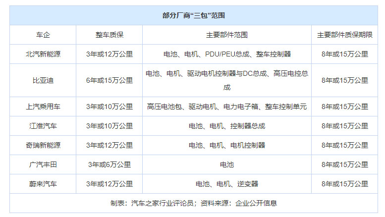 即便如此,但公允地說,汽車廠商對新能源汽車主要零部件的質(zhì)保期限普遍要高于《汽車三包規(guī)定》。這一方面是受國家新能源汽車國補政策的要求,另一方面也是企業(yè)讓消費者放心的措施。但是,不為新能源汽車設(shè)立專門的“三包”規(guī)定也出現(xiàn)了許多問題,其中最突出的一點是,各個廠家對于提供”三包“的主要部件的范圍差別較大,如下表所示。