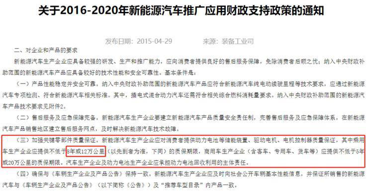 目前,廠商關(guān)于新能源汽車的質(zhì)保標準,是按照2015年時發(fā)布的《財政部、科技部、工業(yè)和信息化部、發(fā)展改革委關(guān)于2016-2020年新能源汽車推廣應(yīng)用財政支持政策的通知》(以下簡稱“2015年國補政策”)中的要求設(shè)定的,即對動力電池等儲能裝置、驅(qū)動電機、電機控制器的質(zhì)量保證,乘用車是不低于8年或12萬公里(以先到者為準)。