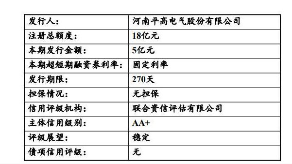 中國(guó)儲(chǔ)能網(wǎng)訊:3月23日,河南平高電氣股份有限公司發(fā)布2020年度第一期超短期融資券募集說(shuō)明書,注冊(cè)總額度為18億元,本次擬發(fā)行5億元超短融,發(fā)行期限270天。