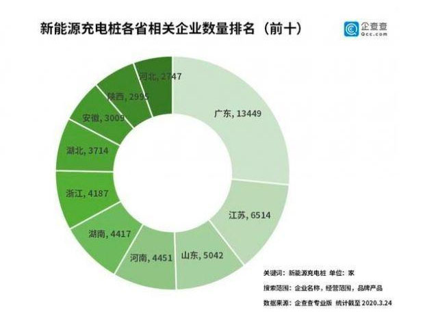 在看看新能源汽車行業(yè)的基礎(chǔ)產(chǎn)品:充電樁相關(guān)設(shè)備。數(shù)據(jù)顯示,我國(guó)共有充電樁相關(guān)企業(yè)7.7萬(wàn)家。廣東省的充電樁相關(guān)企業(yè)數(shù)量最多,共有1.3萬(wàn)家,是第二名江蘇省的兩倍有余。山東省以0.5萬(wàn)家相關(guān)企業(yè)數(shù)量居于第三。