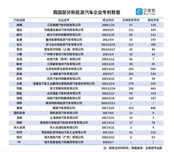 如此多的新能源車企,他們的科研實(shí)力到底如何呢?我們從專利數(shù)量方面來(lái)一窺究竟。企查查數(shù)據(jù)節(jié)選了25家新能源汽車相關(guān)企業(yè)的專利數(shù)據(jù),其中實(shí)用新型專利數(shù)量和其他專利數(shù)量最多的企業(yè)均為北京車和家信息技術(shù)有限公司,分別為382件和565件,其次是蔚來(lái)汽車。實(shí)用新型專利數(shù)量超過(guò)百件的企業(yè)共有8家,占取樣企業(yè)總數(shù)的32%。