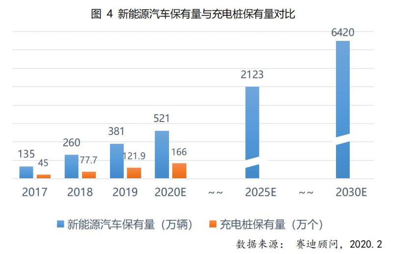 首先,從運(yùn)營角度來看,直流快充樁建設(shè)成本較高(約為交流慢充樁的30~80倍),擴(kuò)大規(guī)模為建設(shè)方帶來巨大的資金壓力。其次,從能源供應(yīng)角度來看,2019年全國充電量約為71億kWh,僅占全國總用電量的0.12%,對電網(wǎng)沖擊較小。預(yù)計(jì)到2030年,新能源汽車全年充電量將達(dá)到975億kWh,占全國用電量占比將達(dá)到1.3%,快充樁主要集中在白天集中充電,巨大的充電功率將為電網(wǎng)帶來較大的負(fù)荷波動。最后,從用戶角度來看,優(yōu)先采用快充主要是因?yàn)槌潆娀A(chǔ)設(shè)施不足,在充電樁普及的條件下,停車即充電更為方便,更加符合大多數(shù)人的用車習(xí)慣。因此,未來擴(kuò)大充電基礎(chǔ)設(shè)施建設(shè),將遵循““慢充為主,快充為輔”的原則,調(diào)整充電樁類型比例,慢充樁逐步提升到80%以上,快充樁僅用于公交、物流等特殊應(yīng)用以及高速公路等場景的應(yīng)急補(bǔ)電。