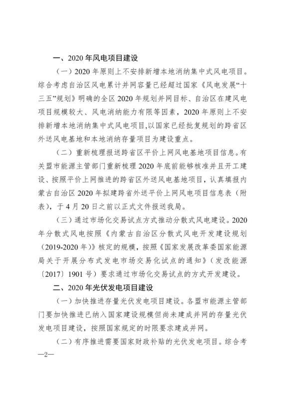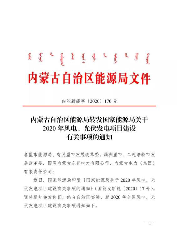 近日,國家能源局發(fā)布了《國家能源局關(guān)于2020年風(fēng)電、光伏發(fā)電項目建設(shè)有關(guān)事項的通知》(國能發(fā)新能[2020]17號,以下簡稱17號文件),為抓好內(nèi)蒙古自治區(qū)2020年風(fēng)電和光伏發(fā)電行業(yè)管理,持續(xù)推動內(nèi)蒙古自治區(qū)風(fēng)電、光伏發(fā)電科學(xué)有序健康發(fā)展,內(nèi)蒙古自治區(qū)能源局將國家能源局通知轉(zhuǎn)發(fā)各盟市,并結(jié)合自治區(qū)發(fā)展實際,提出了2020年風(fēng)電和光伏發(fā)電項目建設(shè)的具體要求。