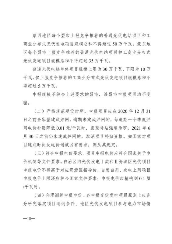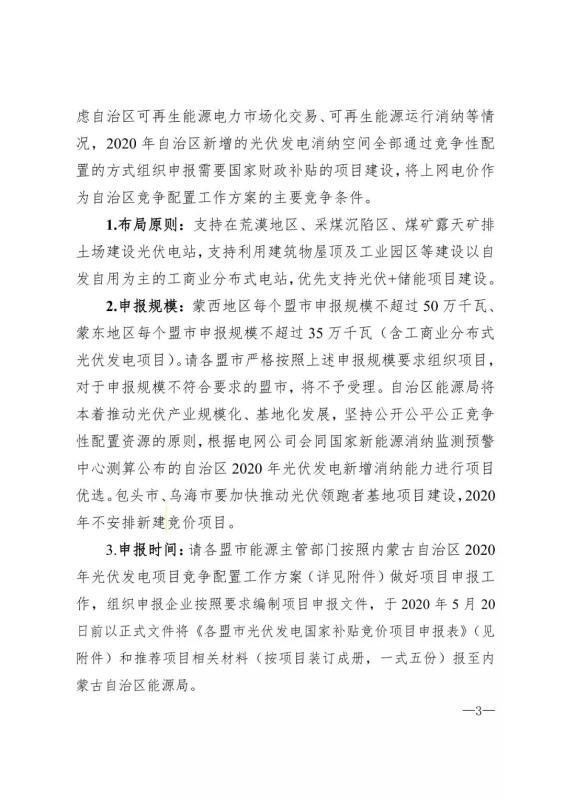 此外,文件要求申報項目應(yīng)在2020年12月31日前建成并網(wǎng),各盟市能源主管部門于2020年5月20日前將擬新建的補貼競價項目報送內(nèi)蒙古自治區(qū)能源局。