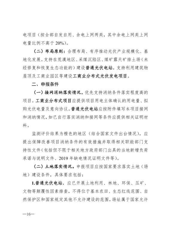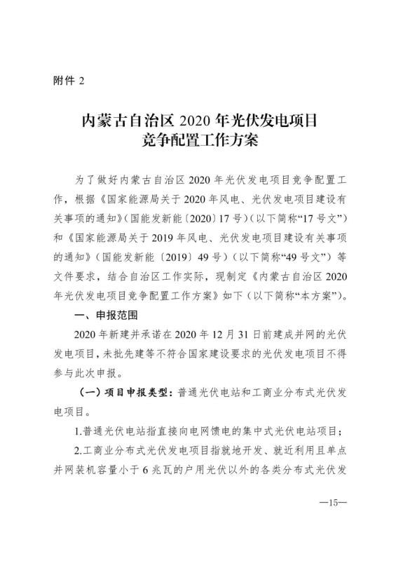 根據(jù)內(nèi)蒙古自治區(qū)黨委十屆十一次全委會暨全區(qū)經(jīng)濟工作會議精神,2020年光伏發(fā)電競價項目支持在荒漠地區(qū)、采煤沉陷區(qū)、露天煤礦排土場建設(shè)光伏電站;支持利用建筑物屋頂及工業(yè)園區(qū)等建設(shè)以自發(fā)自用為主的工商業(yè)分布式電站,工商業(yè)分布式光伏發(fā)電項目支持全部自發(fā)自用和余電上網(wǎng)兩類項目,其中余電上網(wǎng)項目上網(wǎng)電量比例不高于20%;優(yōu)先支持光伏+儲能項目建設(shè)。