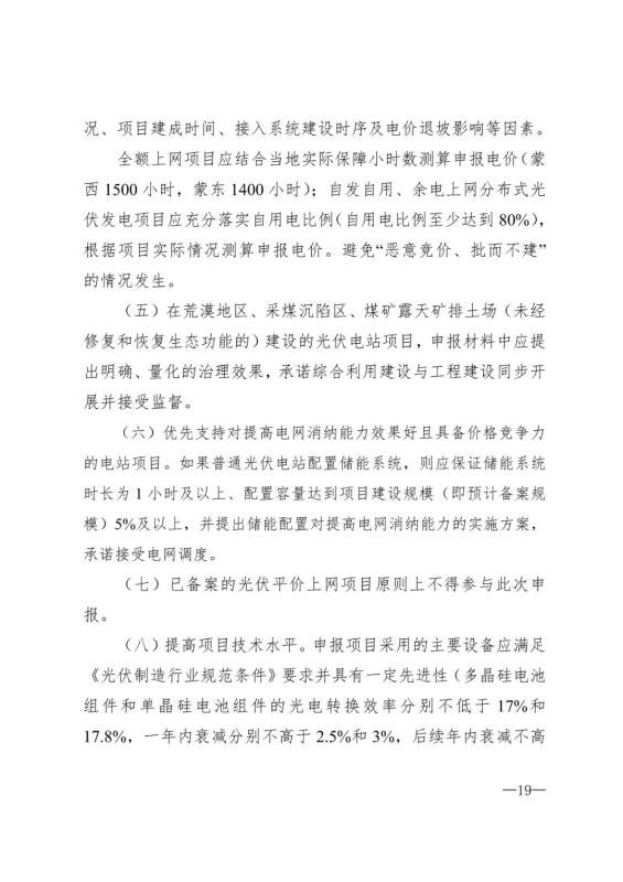 一是加快推進(jìn)存量光伏發(fā)電項目建設(shè)。目前,內(nèi)蒙古自治區(qū)尚有部分納入2019年國家競價補貼的光伏發(fā)電項目、達(dá)拉特旗50萬千瓦光伏領(lǐng)跑者獎勵激勵項目等存量項目尚未建成并網(wǎng)。要求各盟市能源主管部門要加快推進(jìn)已納入國家建設(shè)規(guī)模但尚未建成并網(wǎng)的存量光伏發(fā)電項目建設(shè),按照國家規(guī)定的時限要求建成并網(wǎng)。