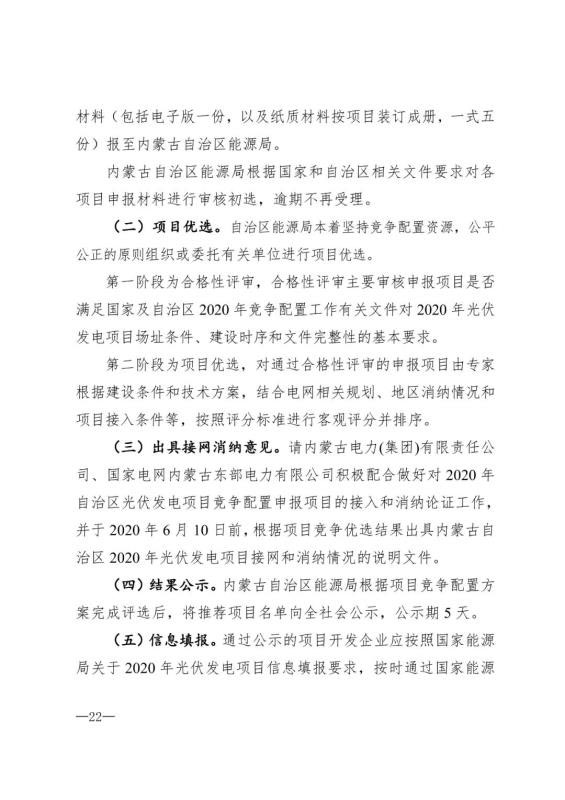 國家能源局要求各?。▍^(qū)、市)能源主管部門于2020年6月15日(含)前按相關(guān)要求將2020年擬新建的補貼競價項目、申報上網(wǎng)電價及相關(guān)信息報送國家能源局。考慮到在上報國家之前還要履行項目優(yōu)選、對外公示等工作環(huán)節(jié),要求各盟市能源主管部門于2020年5月20日前將擬新建的補貼競價項目報送內(nèi)蒙古自治區(qū)能源局。