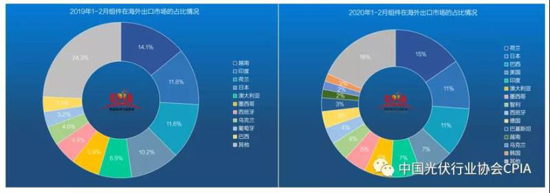 2020年1-2月,海外前五大和前十大組件出口市場(chǎng)占比分別為51%和73%,同比2019年分別下降了3.6個(gè)百分點(diǎn)與2.7個(gè)百分點(diǎn)(2019年1-2月TOP5-54.6%,TOP10-75.7%),海外市場(chǎng)繼續(xù)呈現(xiàn)多元化發(fā)展趨勢(shì)。