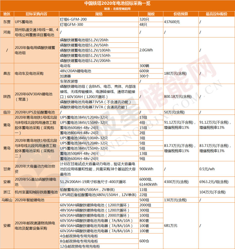 據(jù)北極星儲能網(wǎng)統(tǒng)計,中國鐵塔2020年以來已在20省市發(fā)布了24項招標,總預算超過8945萬元,多項招標要求采購磷酸鐵鋰電池,還有部分招標提及退役動力電池梯次利用。招標需求詳情如下: