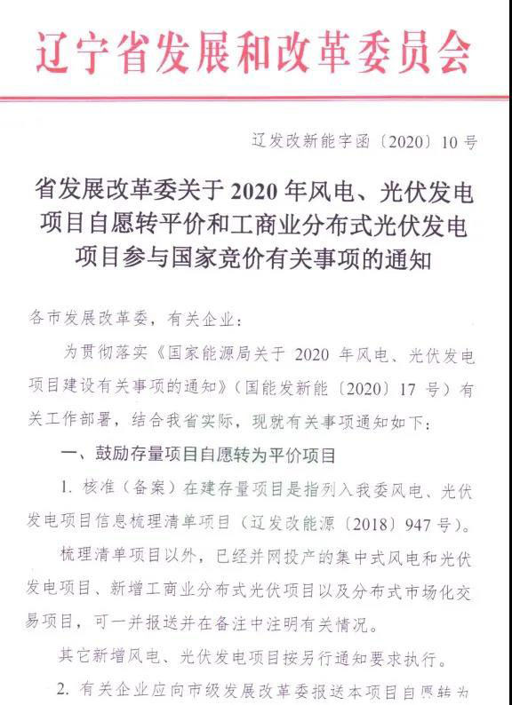 近日,遼寧省發(fā)改委發(fā)布《關(guān)于2020年全省風(fēng)電、光伏有關(guān)事項(xiàng)通知》,主要內(nèi)容有兩條:鼓勵(lì)存量項(xiàng)目自愿轉(zhuǎn)為平價(jià)項(xiàng)目、支持工商業(yè)分布式光伏發(fā)電項(xiàng)目參與國(guó)家競(jìng)價(jià)!