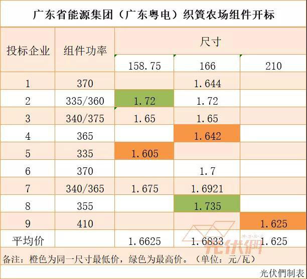 據(jù)光伏們了解,通過技術(shù)標(biāo)與商務(wù)標(biāo)之后,共有9家企業(yè)進(jìn)入經(jīng)濟(jì)標(biāo)階段。其中,158尺寸共有4家企業(yè)參與報價,最低單價為1.605元/瓦,最高為1.72元/瓦,均價為1.6625元/瓦;166有7家企業(yè)參與,最低單價為1.642元/瓦,最高單價為1.735元/瓦,均價為1.6883元/瓦;210組件則僅有一家企業(yè)參與投標(biāo),報價為1.625元/瓦。具體價格見下表: