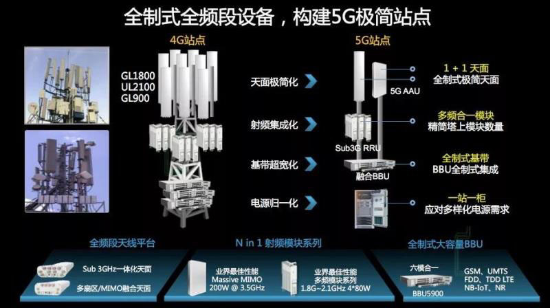 在實(shí)際部署中, 5G設(shè)備支持全制式大容量BBU產(chǎn)品方案、N in 1多制式融合射頻和全頻段天線,可實(shí)現(xiàn)站點(diǎn)極簡,降低能耗和鐵塔租金。結(jié)構(gòu)如下: