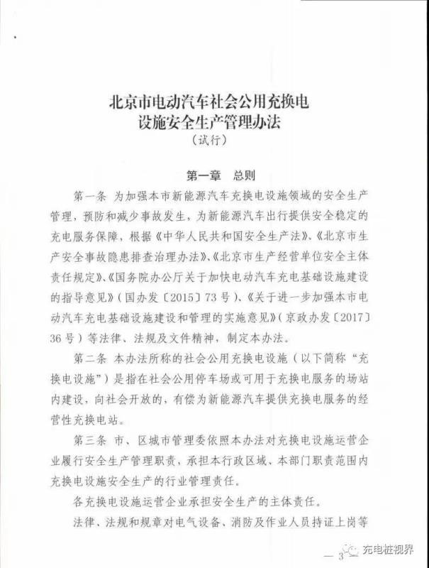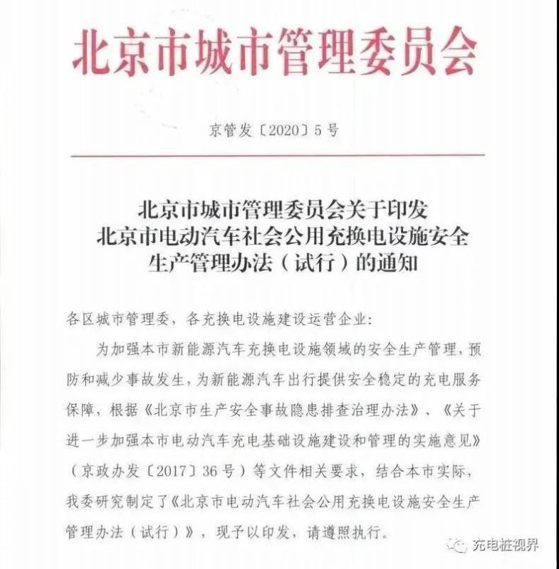 北京市城市管理委印發(fā)的《北京市電動汽車社會公用充換電設(shè)施安全生產(chǎn)管理辦法(試行)》,規(guī)定將定期組織第三方專業(yè)機構(gòu)對本市行政區(qū)域內(nèi)的社會公用充換電場站進行安全生產(chǎn)抽查,并建立充換電設(shè)施安全預(yù)警提示制度。