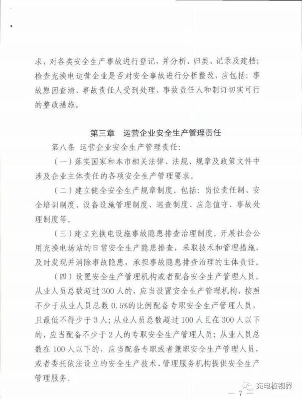 在運營企業(yè)安全生產(chǎn)管理責(zé)任方面,《北京市電動汽車社會公用充換電設(shè)施安全生產(chǎn)管理辦法(試行)》規(guī)定運營企業(yè):