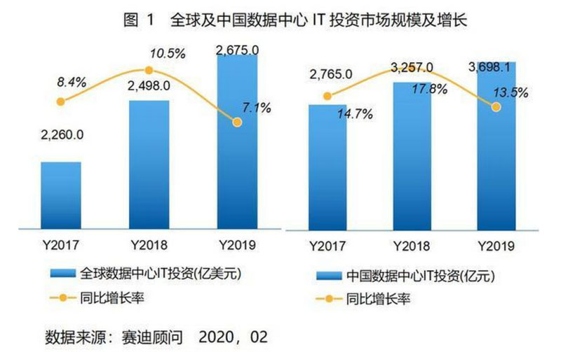 云計算、大數(shù)據(jù)、物聯(lián)網、人工智能等新一代信息技術快速發(fā)展,數(shù)據(jù)呈現(xiàn)爆炸式增長,數(shù)據(jù)中心建設成為大勢所趨。世界主要國家和企業(yè)紛紛開啟數(shù)字化轉型之路,在這一熱潮推動下,全球數(shù)據(jù)中心IT投資呈現(xiàn)快速增長趨勢。全球及中國數(shù)據(jù)中心IT投資規(guī)模增長率均高于全球GDP增長率(2.3%)和中國GDP增長率(6.1%)。