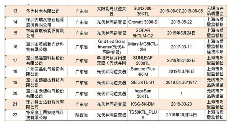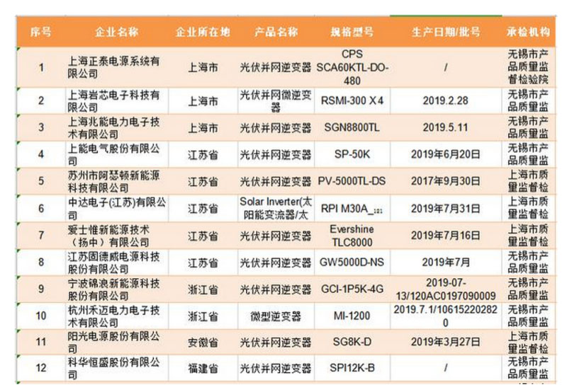 近期,市場監(jiān)管總局公布了2019年并網光伏逆變器質量國家監(jiān)督抽查情況。共抽查了7個?。ㄊ校?,包括華為,陽光,錦浪科技、禾望,固德威,特變電工、科士達在內的23家光伏逆變器企業(yè)成產的23批次光伏并網逆變器產品,其中1批次產品不合格,不合格發(fā)現(xiàn)率為4.3%。
