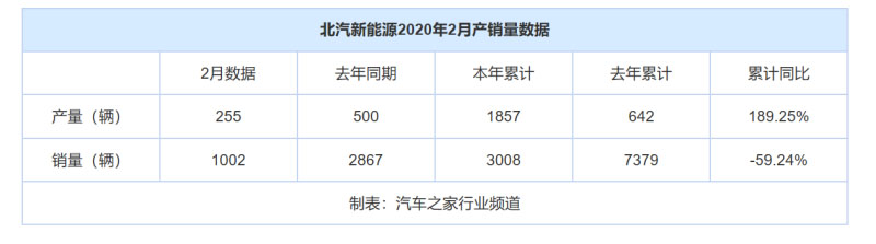 春節(jié)假期影響消除后,新冠肺炎疫情對(duì)于汽車行業(yè)的沖擊開始顯現(xiàn),新能源領(lǐng)域也不能幸免。根據(jù)北汽新能源最新發(fā)布的產(chǎn)銷數(shù)據(jù),2月銷量為1002輛,較去年同期的2867輛減少65%。降幅比1月(-55.54%)降幅進(jìn)一步擴(kuò)大。1-2月,北汽新能源累計(jì)銷量為3008輛,同比減少59.24%。